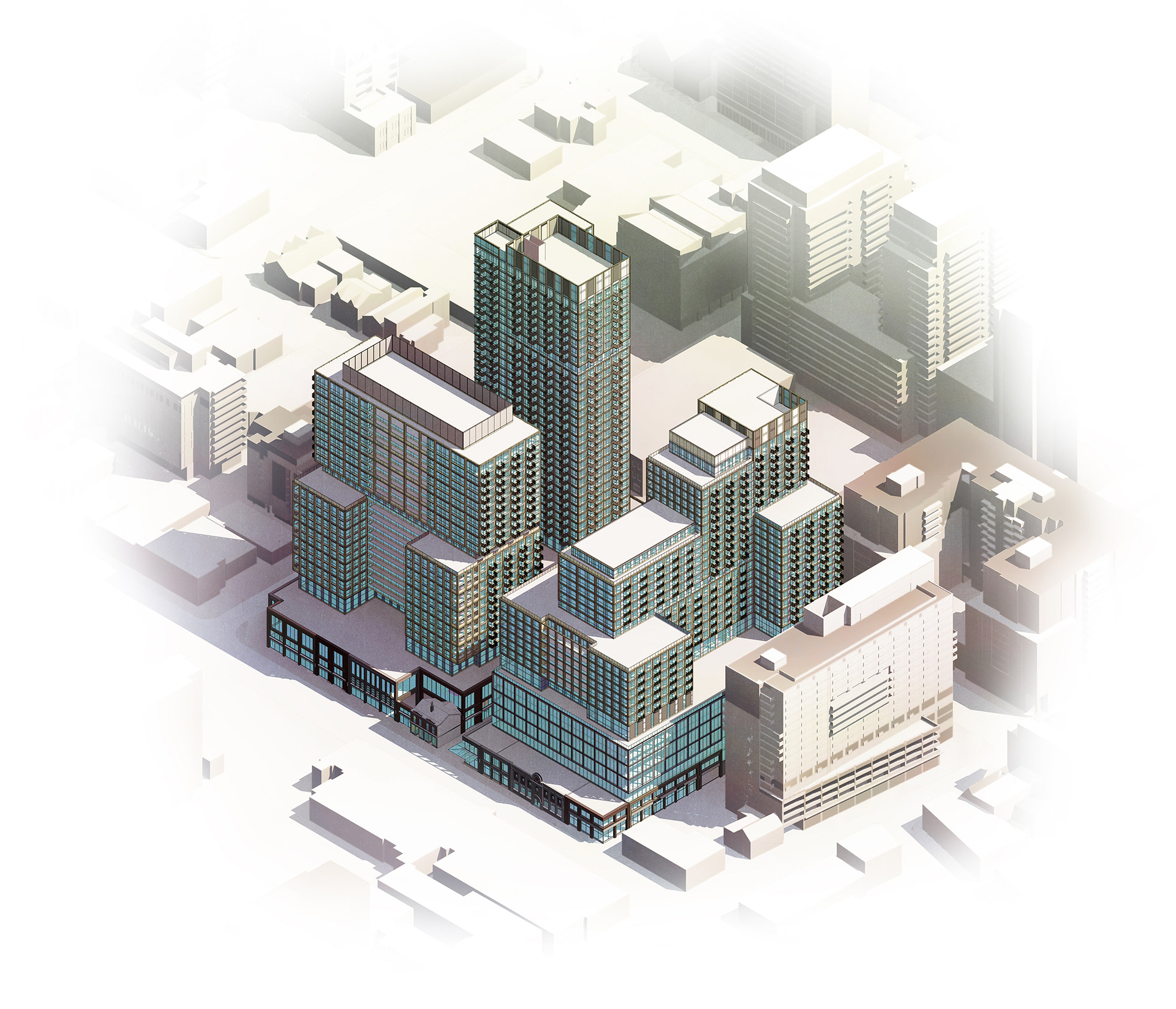 The project is a mixed used high-rise building located in Toronto. It is a part of the larger development that takes place in the newly gentrified part of eastern Toronto, directly connected to downtown. The building is a 25-floor tower type design where the fist 6 floors are meant for renting options. The project is devised into three phases: phase 1 - Building A, phase 2- Building B and phase 3 - Building C.